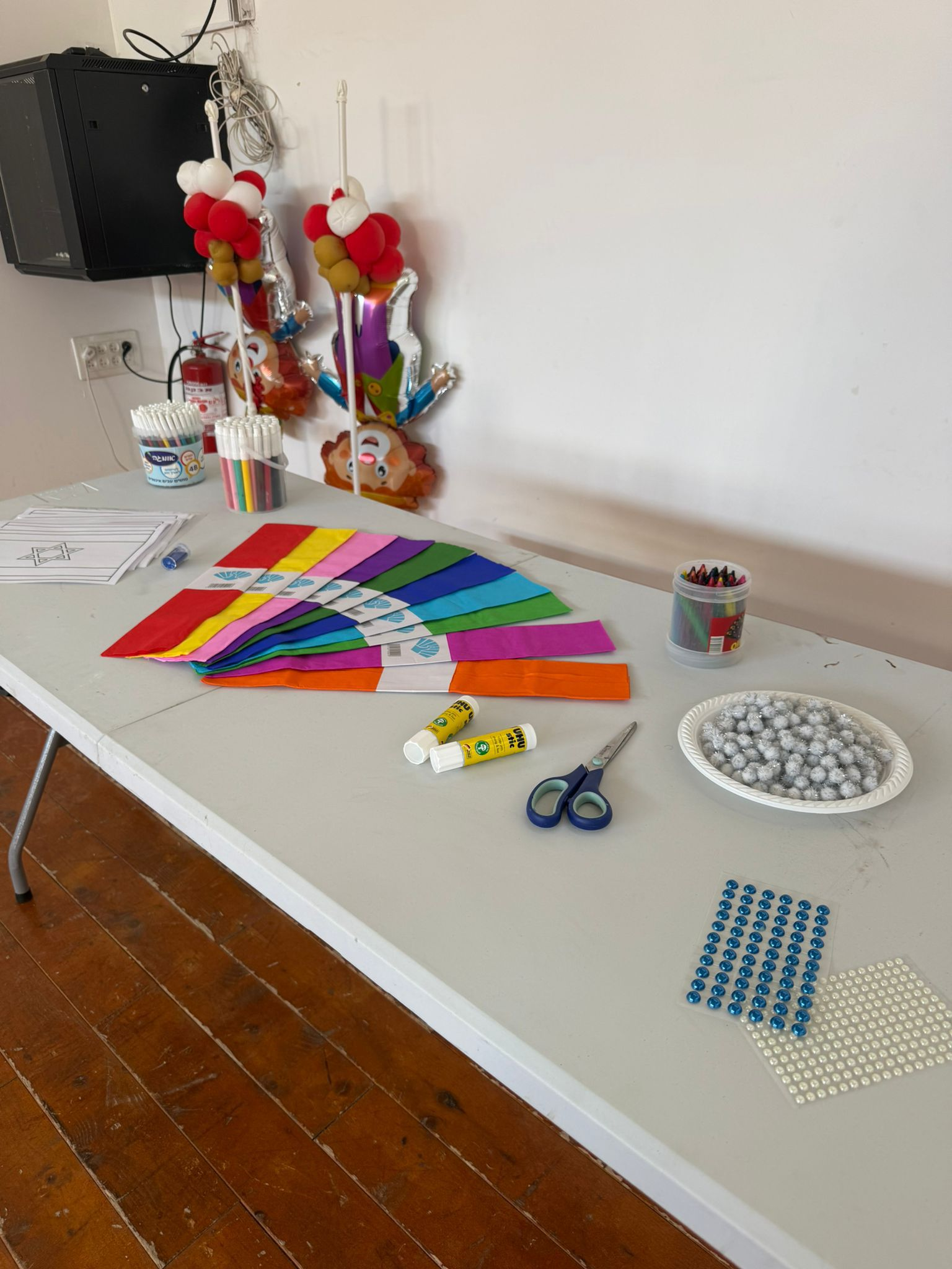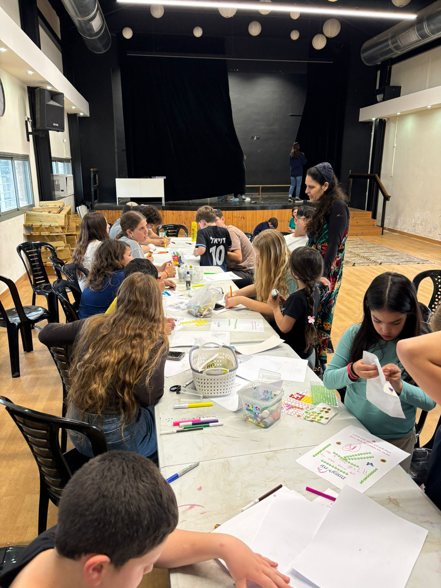 ילדים שיושבים יחד, מציירים דגלים קטנים .